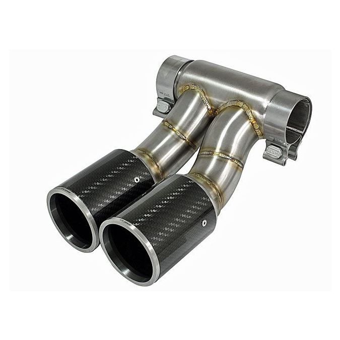 aFe is proud to introduce the aFe dual tip upgrade for the 2013-2015 Porsche Cayman S/Boxster S (981) with the H6-3.4L engine. Realizing that the OE exhaust tip could be improved, aFe designed a special dual 3.5' carbon fiber, 304 stainless steel exhaust tip assembly that is more free-flowing than the stock tip assembly. This aFe tip assembly comes with a brushed finish and is 100% hand TIG-Welded for a perfect, precise fit and a complete bolt-on installation. No modifications necessary.