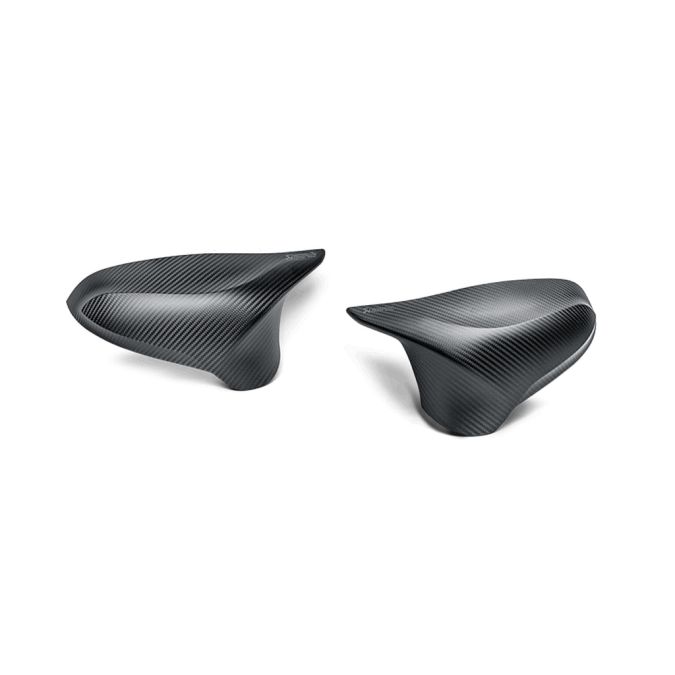 Akrapovič carbon fiber mirror caps for left hand drive BMW F8X M2, M3 and M4 models. Purchase includes a set of 2 mirror caps in your choice of matte or a gloss carbon fiber finish.