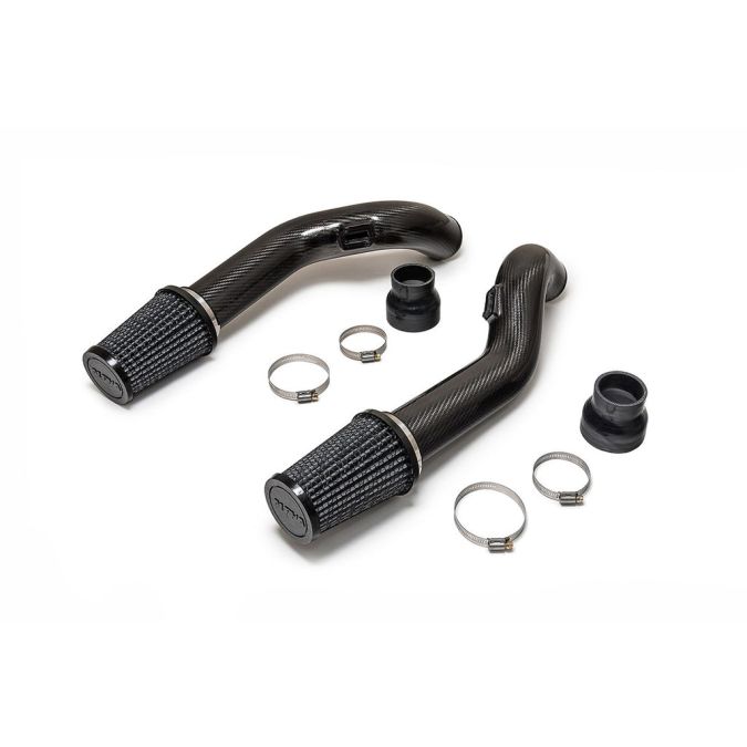 With this intake installed, bulky air filter boxes are replaced with our high flow dry media filters and carbon fiber tubing. This eliminates clutter within the engine bay while drawing cooler air from outside. Increasing the cross sectional area of the tubing allows the factory MAF sensors to accurately meter air flow up to and over 1000HP! A vast improvement over the stock intake system