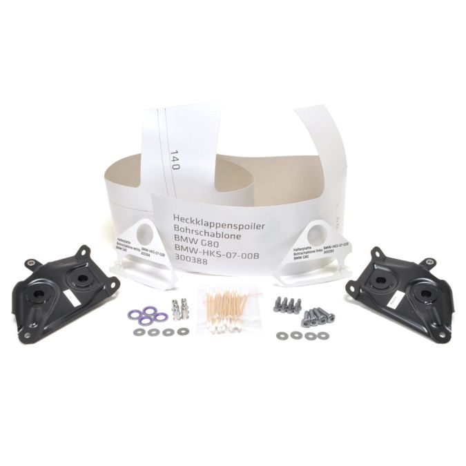 Genuine BMW install kit for the M Performance carbon fiber flow-through rear wing spoiler fits the the 2021+ G80 M3 and G82/G83 M4 models. This kit includes the left and right spoiler brackets, hardware and templates.