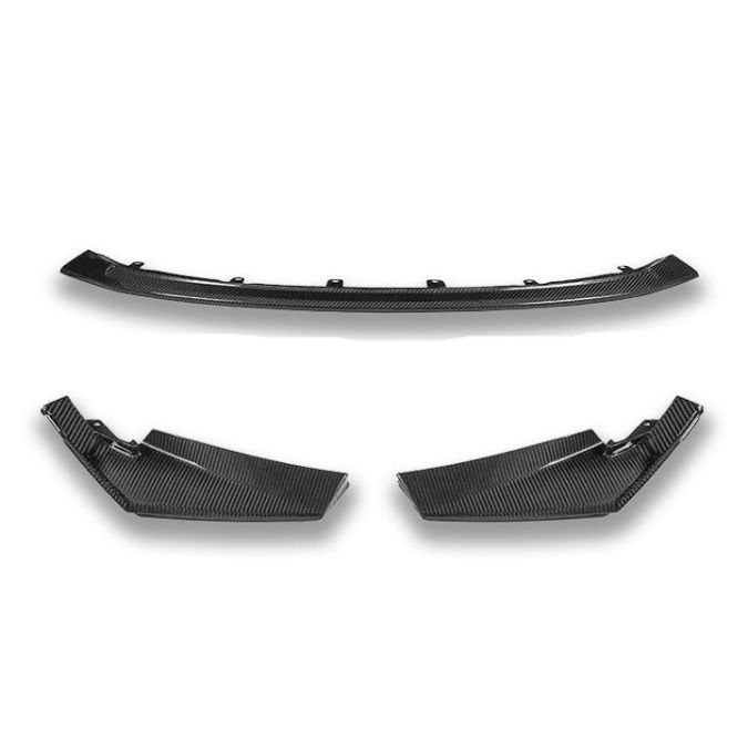 The CSL style front splitter is made with high quality dry carbon with three separate pieces: Front lip, left and right side splitters. When installed, all three pieces connect to give your vehicle a sporty look with a lower looking stance.