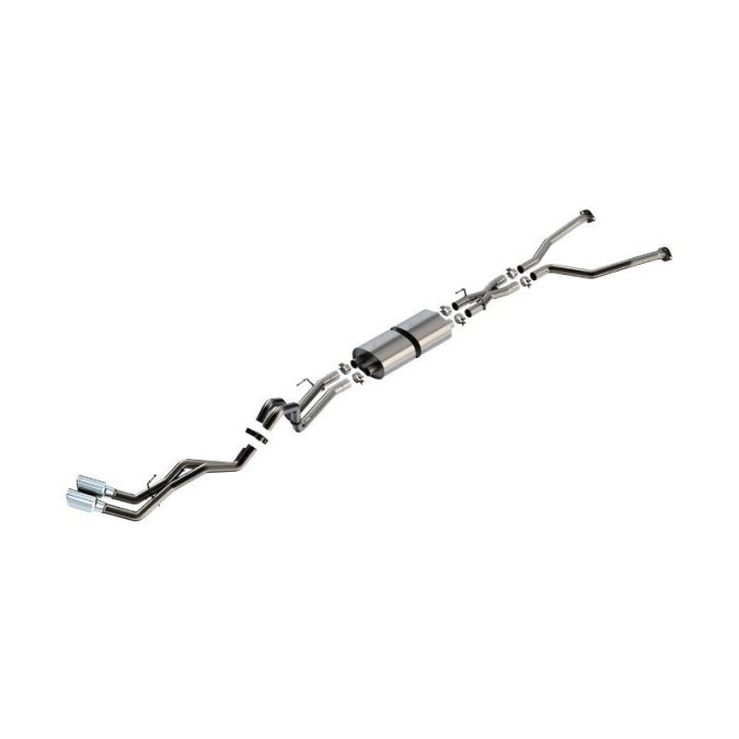 Includes Hybrid models. This Cat-Back(tm) system features a True Dual design with two full tail pipes that is unique in the industry. It was designed specifically for the Tundra 3.4L. The system features the aggressive BORLA(r) ATAK(r) muffler and Polyphonic Harmonizer Technology inside the muffler assembly which utilizes patented units that contain pipes of different diameters and lengths to create multiple exhaust notes that harmonize to deliver a clean, rich, full-bodied sound without any drone. The system also features a Merge X-Pipe for increased performance and improved sound. The system is finished off with 4.5 bright chrome on T-304 stainless steel tips. Systems with black chrome on T-304 stainless steel tips and carbon fiber with black anodized center tips are also available. It is built with premium, high-quality austenitic T-304 stainless steel for a sharp appearance and long life. Our computer numerical control (CNC) manufacturing techniques ensures accurate fit and maximum performance. Mandrel bends ensure maximum flow & power. Best of all, BORLA(r) stands behind every system with a Million-Mile Warranty. Just what you'd expect from the world's most experienced (and most winning) exhaust brand. System Features: Cat-Back(tm) Exhaust System 2.5 True Dual Design ATAK(r) Sound Level No Drone Polyphonic Harmonizer Technology Dual 4.5 Bright Chrome On T-304 Stainless Steel Tips T-304 Stainless Steel Million-Mile Warranty