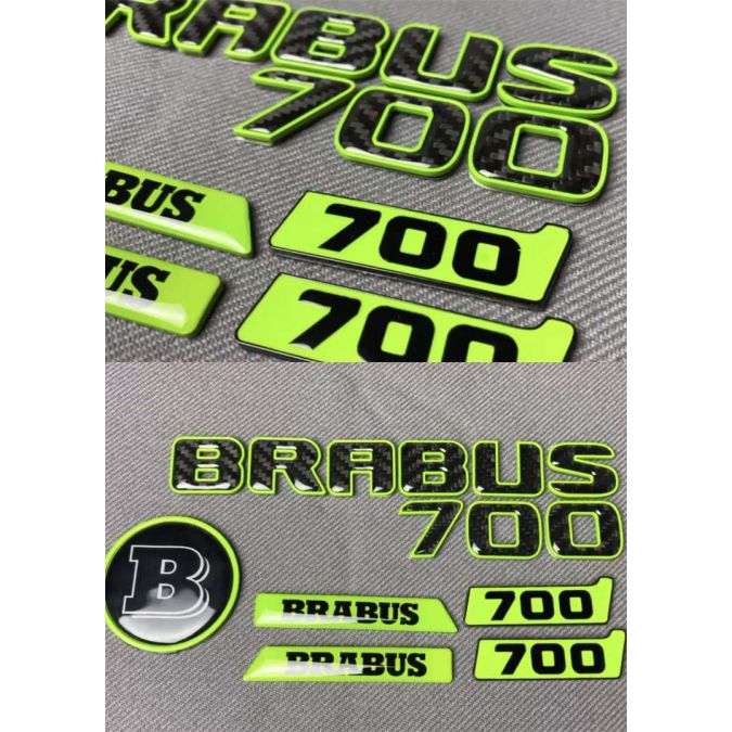 We are pleased to present you a special offer for a Set of Badge Emblems in the Brabus 700 Green Metal and Carbon New style, also known as the Rocket style. These emblems are designed for Mercedes Benz W464, W463A, and various G-Class models, including G63, G500, and G350.