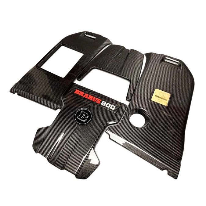 Introducing the Carbon Fiber Brabus 800 Engine Cover with Badges Set for AMG Mercedes-Benz W463A/W464 G-Wagon G63 G-Class. Amplify the performance and elevate the style of your G-Wagon with this top-of-the-line engine cover.
