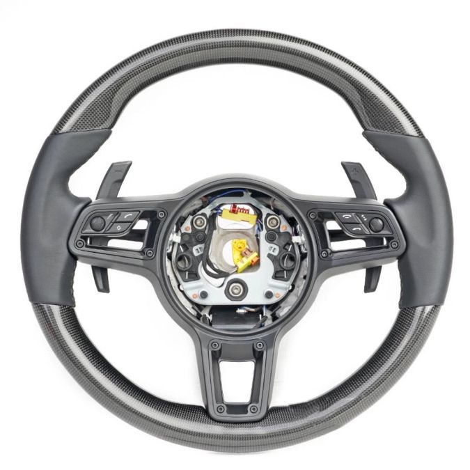 Porsche Lenkrad, welches an den Seiten mit Alcantara und ober-/unterhalb mit Echtcarbon veredelt und in mehreren Schichten mit UV-beständigem Klarlack versiegelt wurde. Es handelt sich nicht um eine einfache Carbon-Optik (z.B. Wassertransfer oder Folie) sondern um hochwertiges und exklusives Echt-Carbon. Das Lenkrad ist frei konfigurierbar. Bedeutet Nahtfarbe und 12 Uhr Markierung individuell anpassbar.