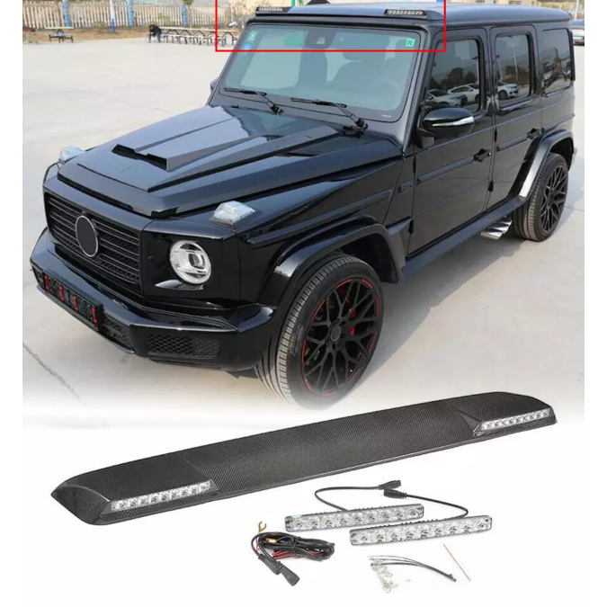 Der Carbon Frontspoiler wird auf das Dach befestigt und betont mit seinem High-Tech-Charakter die Individualität und Sportlichkeit des Fahrzeugs.
