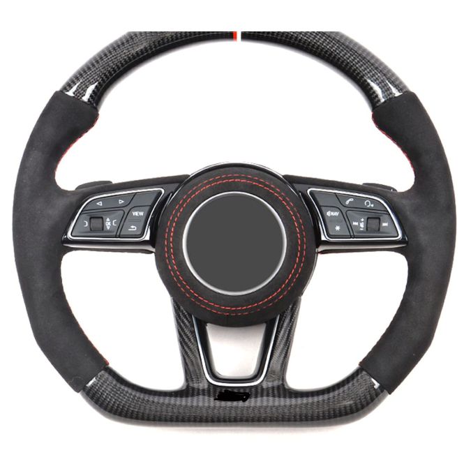 Audi Carbon Lenkrad für alle gängigen S Line & S Modelle, welches an den Seiten mit Alcantara oder Leder und ober-/unterhalb mit Echtcarbon veredelt und in mehreren Schichten mit UV-beständigem Klarlack versiegelt wurde. Es handelt sich nicht um eine einfache Carbon-Optik (z.B. Wassertransfer oder Folie) sondern um hochwertiges und exklusives Echt-Carbon.