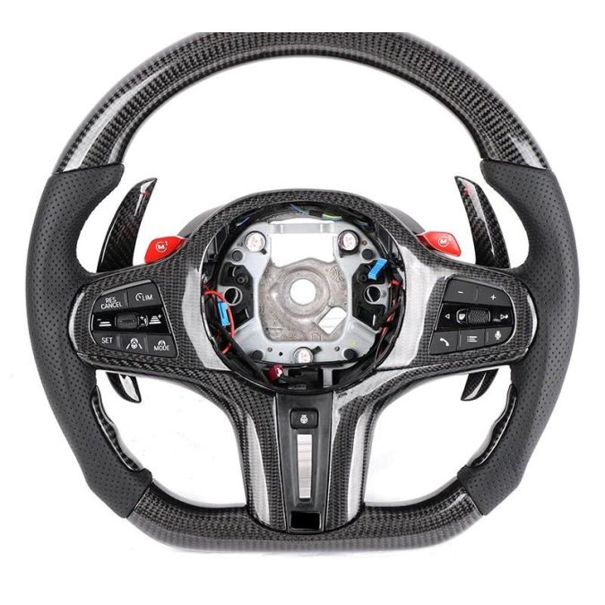 Carbon Lenkrad mit wahlweise ohne oder mit LED Anzeige kompatbiel mit BMW M8 F91 & F92, welches an den Seiten mit Alcantara und ober-/unterhalb mit Echtcarbon veredelt und in mehreren Schichten mit UV-beständigem Klarlack versiegelt wurde. Es handelt sich nicht um eine einfache Carbon-Optik (z.B. Wassertransfer oder Folie) sondern um hochwertiges und exklusives Echt-Carbon.