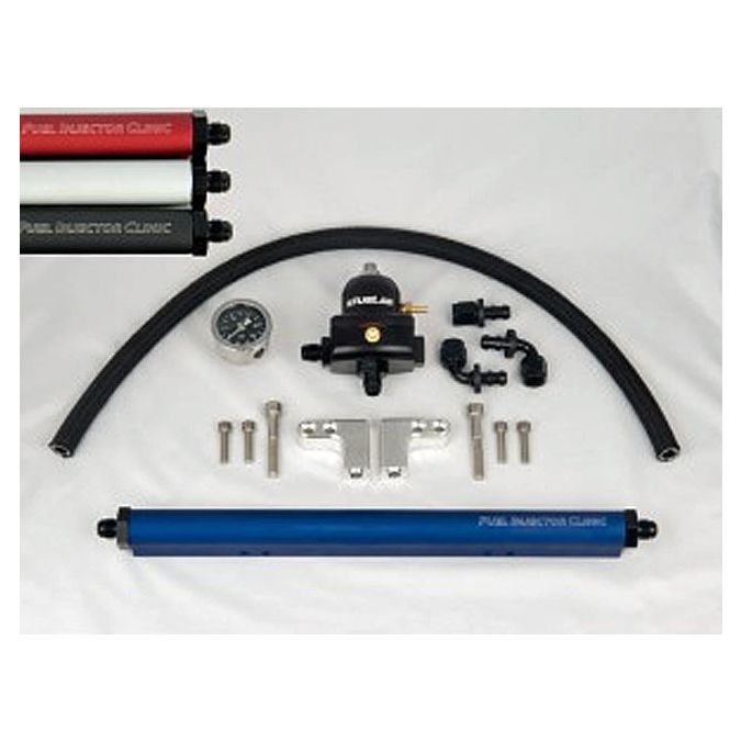 Complete DSM Fuel Rail Kit sells only in combination with 4 x DSM Injectors of any size (add cost of injectors to the kit price) and includes: DSM Fuel Rail (Available in black, red, blue or silver) with -6AN in and outlet fittings, 51502 FueLab EFI fuel pressure regulator in black, Carbon face liquid filled Fuel Pressure Gauge , 2 x 90 Deg -6 fittings, 1x Straight -6 fitting (all AN fittings are black) and 2ft -6 HP fuel hose.