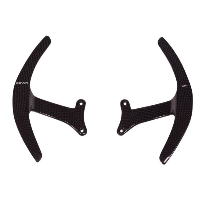 Upgrade your driving experience with the Ferrari California T - Carbonio Challenge Extended Carbon Fibre F1 Shift Paddles from Auto-Parts, UAB. Designed by Carbonio, these paddles address the limitations of the factory-installed shift paddles by extending functionality, allowing seamless gear changes even when the steering wheel is turned. Crafted with autoclaved pre-preg carbon weave, they perfectly match the OEM Ferrari carbon fiber and boast a clear-coated, mirror-like finish. Developed with AIM Autosport and backed by an unlimited mileage guarantee, these paddles combine innovation with stunning aesthetics for a factory-fresh look. Easy to install, they feature OEM-perfect fit with silk-screened ‘UP’ and ‘DOWN’ labels, just like the original. Elevate your drive to racing standards today!
