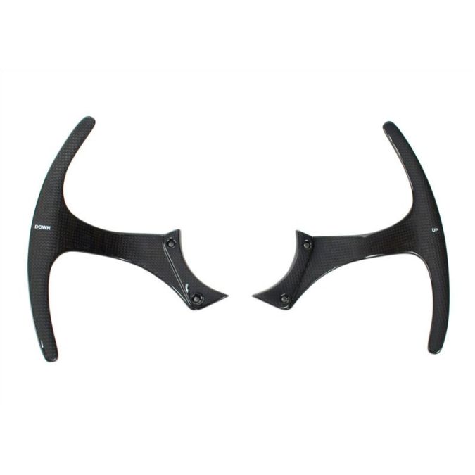 The aluminum OEM Ferrari F1 shift paddles on F430 models suffer from the design flaw that they are fixed and do not turn with the steering wheel. As a result shifting is only possible with the steering wheel straight or if the driver re-positions their hands. Ferrari addressed this on their racing models by using very long paddles that allow the driver to change gears when the steering wheel is turned. Carbonio has manufactured these longer paddles for the enthusiast Ferrari owner in aerospace carbon fiber. Beautifully finished and easy to install, these paddles offer a practical upgrade to the shifting of the F430.