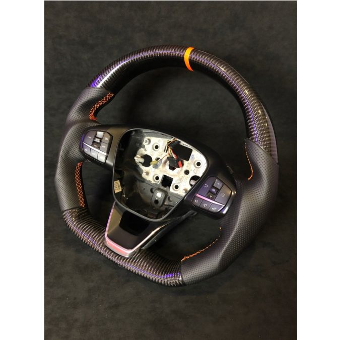 Upgrade your Ford Transit Custom MK8 with this custom sport steering wheel featuring a flat bottom design in carbon and black leather with a pop of orange. This genuine OEM wheel comes with custom features like a custom carbon finish, ergonomic thumb rests, and ridged sides for a unique and stylish look. Fits models from 2014 onwards. Please note that trim and buttons are included, but airbag is not. Stand out on the road with this stunning and unique steering wheel upgrade.