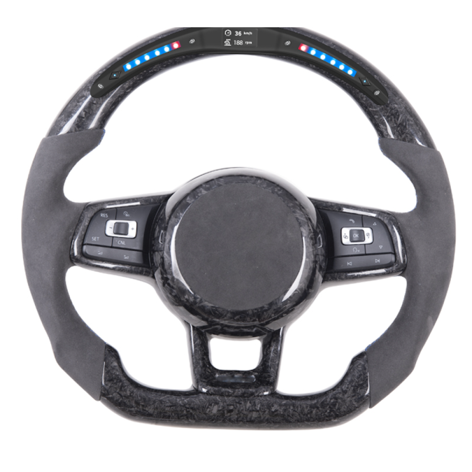 VW Golf 7 GTI/GTD/R Forged Carbon LED Lenkrad mit integriertem Bildschirm zur Anzeige von Sensordaten (z.B. Öl-, Kühlwassertemperatur etc.), welches an den Seiten mit Leder und ober-/unterhalb mit Echtcarbon veredelt und in mehreren Schichten mit UV-beständigem Klarlack versiegelt wurde. Es handelt sich nicht um eine einfache Carbon-Optik (z.B. Wassertransfer oder Folie) sondern um hochwertiges und exklusives Echt-Carbon.