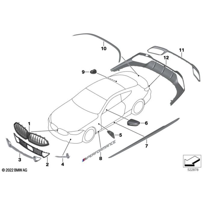 Important: The installation instructions are not included in the retrofit kit. The latest installation instructions must be printed from the Electronic Parts Catalogue (EPC) and given to the customer. Components which are not listed in the installation instructions are installed acc.to ISTA/AIR. Note: For Mainland China: Retrofitting not following GA-801 2019 is only allowed for use on race-track and not for use on public roads according to the relevant retrofitting regulation. For G14, G15, G16 Outside mirror shrouds carbon, Trims air duct side panel CFRP and Rocker panel covers carbon do not follow GA-801 2019.