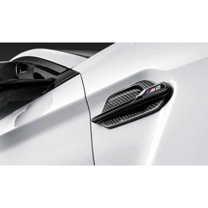 Athletic on the one hand. Individual on the other. The M Performance Air Breather decorative slat is made of premium carbon fibre. Its dynamic design emphasizes the vehicle's athletic character. An elegant visual highlight on the side of the car - in durable BMW quality. Featuring the BMW M2 logo.