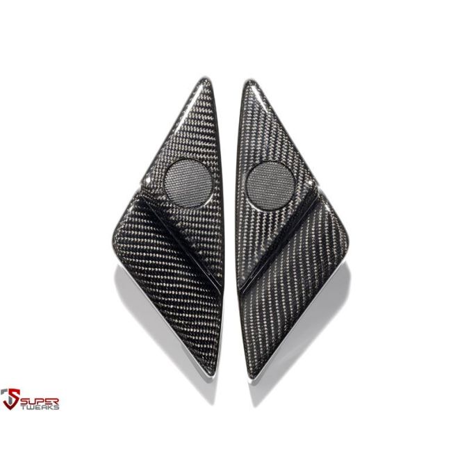 Carbon fiber covers for the side mirrors, on the inside of the car. Surround for loud-speakers. Will fit both left hand drive cars and right hand drive cars.