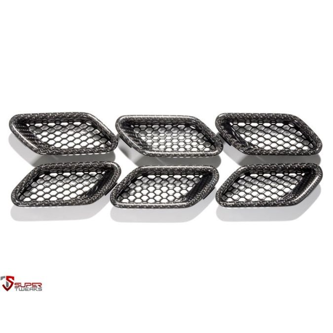 Carbon fiber frame for the side air intakes, including the grills. Three on each side. Located on the left and right sides of the car.