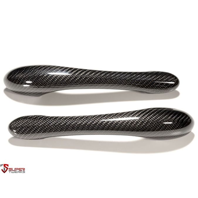 Carbon fiber exterior front door pulls/door opener handles. Located on the left and right sides of the car.