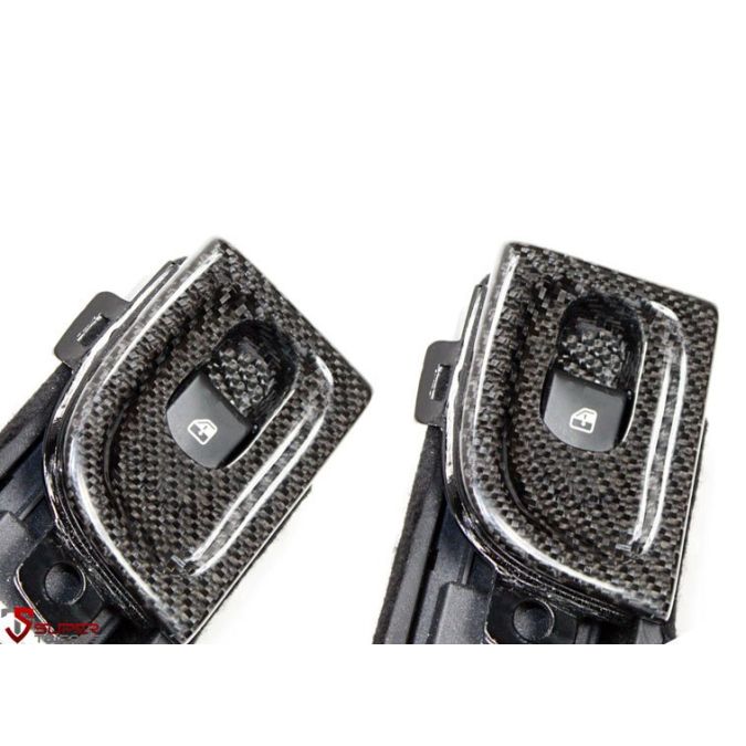 Complete window switch units for the rear door panels in carbon fibre (pair, left and right). Will fit both left hand drive cars and right hand drive cars.