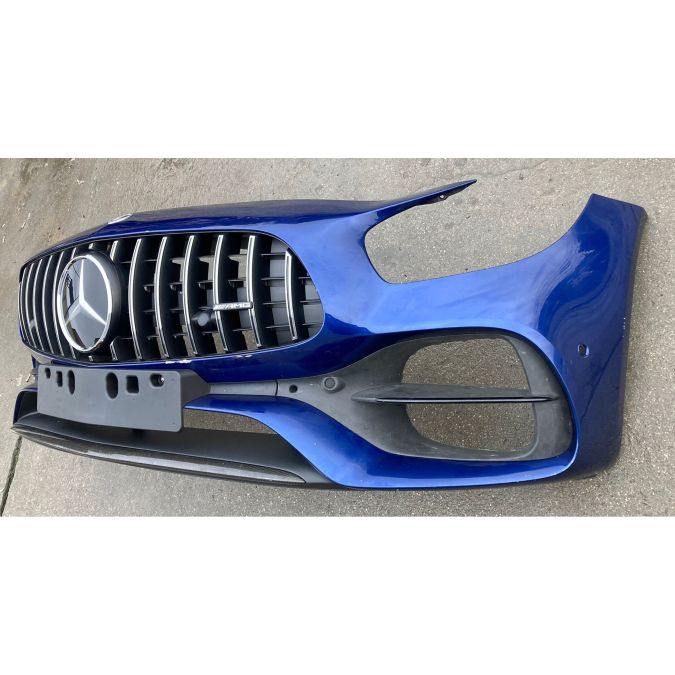 Get the genuine OEM front bumper for your Mercedes AMG GT Coupe GTS GTC 6.3 in Carbon Blue. This facelift model bumper comes with a carbon bottom lip, PDC sensors, and center grill with center piece. Contact us before ordering to ensure availability. Worldwide shipping available. Call us for any questions or to inquire about other Mercedes parts.