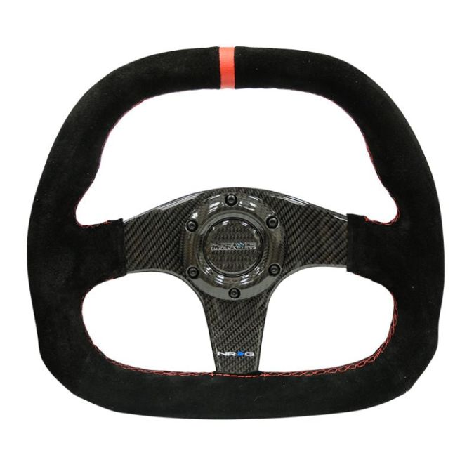 NRG Carbon Fiber Steering Wheel (320mm) Flat Btm. Blk Suede/Red Stitch w/CF Spokes & Red Center Mark