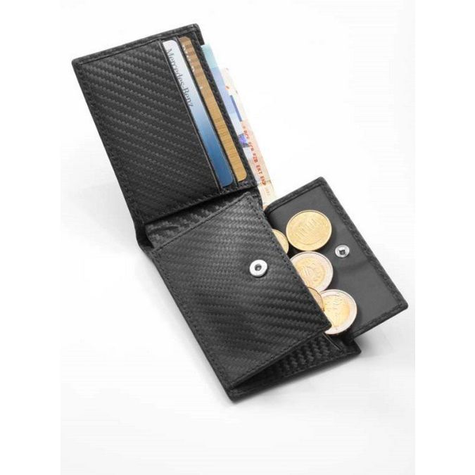 Die AMG Minigeldbörse ist die optimale Lösung, wenn Sie eine platzsparende Aufbewahrung für Ihre Zahlungsmittel suchen. Sie ist schnell und unkompliziert in jeder Tasche verstaut. Aus hochwertigem Carbonleder gefertigt, bietet der in der Farbe Schwarz erhältliche Minigeldbeutel ein Fach für Geldscheine, Münzgeld und Belege. Auch Kredit- oder EC-Karten können in zwei zusätzlichen Kartenfächern problemlos verstaut werden. Handmade in Germany überzeugt diese Geldbörse nicht nur durch ihre edle Erscheinung, sondern auch durch ihre hochwertige Verarbeitung.