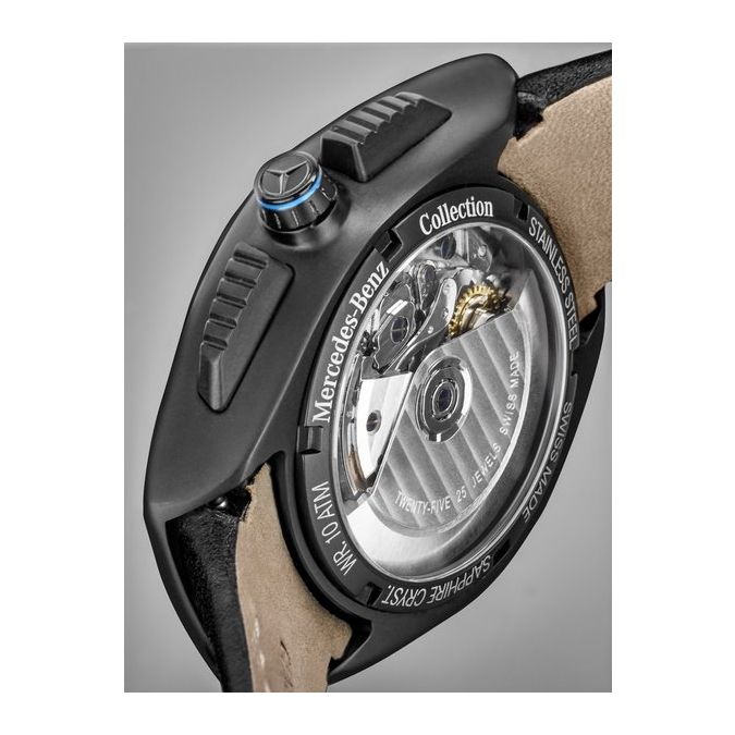Der schwarze Automatikchronograph für Herren verfügt über ein Edelstahlgehäuse und ist mit einer PVD-Beschichtung versehen. Dank des gewölbten, beidseitig entspiegelten Saphirglases an der Oberseite des Gehäuses lässt sich das Zifferblatt aus schwarzem Carbon mit CD Schliff in den Zähleraugen optimal erkennen. Stahlfarbene, applizierte Indexe und ein aufgesetzter Minuteriering sowie der Mercedes Stern setzen zudem optische Highlights auf dem Zifferblatt des sportlich, aggressiven Automatikchronographen. Die Spitzen der stahlfarbenen Stunden- und Minutenzeiger sowie des blauen Sekundenzeigers sind in die Leuchtmasse Super-LumiNova® getaucht und ermöglichen so auch im Dunkeln ein Ablesen der Uhrzeit. Die Herrenuhr verfügt über ein schwarzes Lederband mit hochwertiger Faltschließe und steht so für einen angenehmen Tragekomfort ein. Durch den Saphirglasboden lässt sich das schweizer Automatikwerk ETA 7750 sehen. Die Automatikuhr ist nach dem Vorbild der Mercedes-Benz Designphilosophie entwickelt worden.
