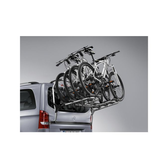 Hochwertiger Träger aus eloxiertem Aluminium zur einfachen und sicheren Montage an der Heckklappe. Für bis zu 4 Fahrräder (bzw. 2 E-Bikes) nahezu aller Typen und Größen. Auch mit montiertem Fahrradheckträger lässt sich die Heckklappe öffnen. Ohne Rückleuchtenwiederholung und damit auch ohne Stromversorgung am Heck verwendbar. Geeignet für Vito, V-Klasse, Marco Polo und Fahrzeuge mit AMG-Abrisskante.