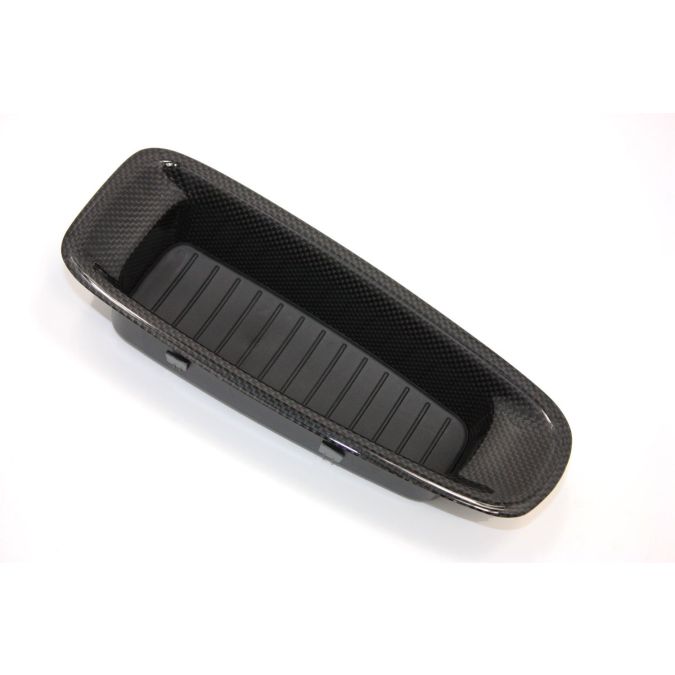 Carbon fiber interior center storage box on rear console between the rear seats, includes rubber mat. Will fit both left hand drive cars and right hand drive cars.