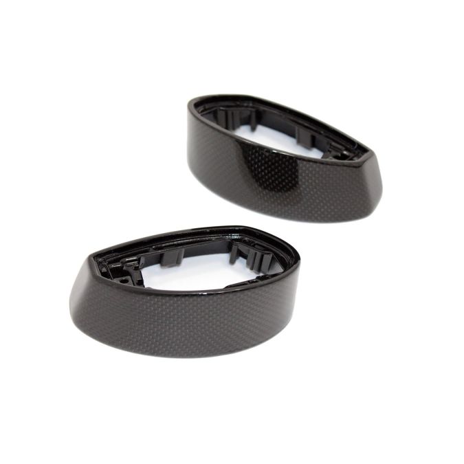 Carbon fiber exterior bases for the side mirrors (left and right), attaching to the doors. For standard mirrors only (not the sport design mirrors). Will fit both left hand drive cars and right hand drive cars.