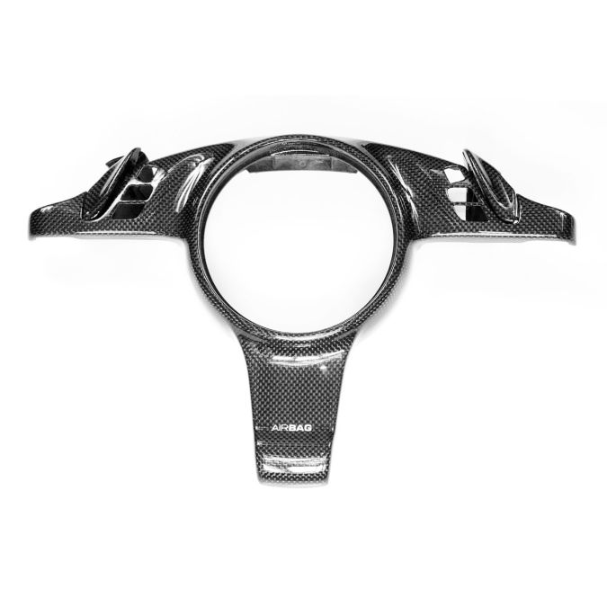 Carbon fiber interior surround for the airbag, cover on steering wheel. Includes the tiptronic switches and all decals. For multifunction steering wheel. Will fit both left hand drive cars and right hand drive cars.