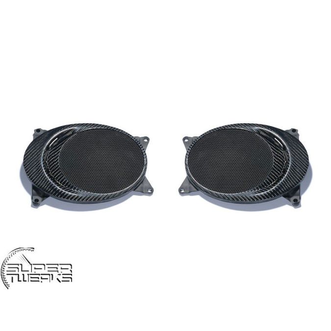 Carbon fiber interior Loud Speaker Covers (left and right). Covers/Grills for the loud-speakers from the door panels, left and right. Will fit both left hand drive cars and right hand drive cars.