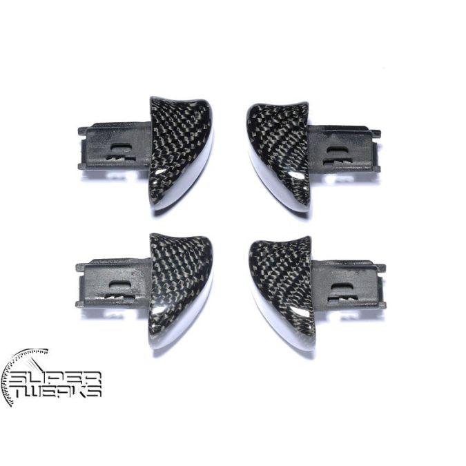 Carbon fiber interior Seat Release Handles for Sport Seats (left and right). 4 release handles for the seat back, each seat r+l, for the sport seats. Will fit both left hand drive cars and right hand drive cars.