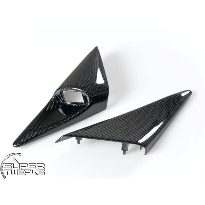 Carbon fiber interior Loud Speaker Covers (left and right). Interior covers for the side mirrors, left side with place for the mirror switches. Supplied as a pair. Will fit both left hand drive cars and right hand drive cars.