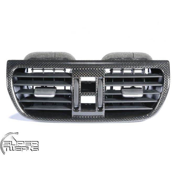 Carbon fiber interior centre vent (complete unit), located on the dashboard. Including the little fins, the adjusting wheels and the complete air passages. Will fit both left hand drive cars and right hand drive cars.