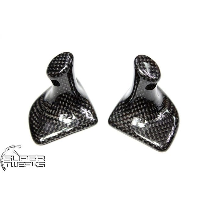 Carbon fiber interior rear seat handles, supplied as a pair, left and right. Handles for rear seat backs. Will fit both left hand drive cars and right hand drive cars.