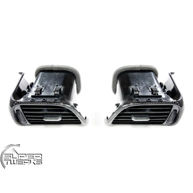 Carbon fiber interior side vents, located on the dashboard. Including the little fins, the adjusting wheels and the air passages. Will fit both left hand drive cars and right hand drive cars.