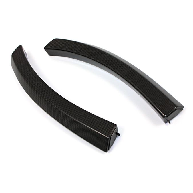Carbon fiber exterior small side spoiler lips for the front bumper, attaching to main spoiler lip (left and right). Will fit both left hand drive cars and right hand drive cars.