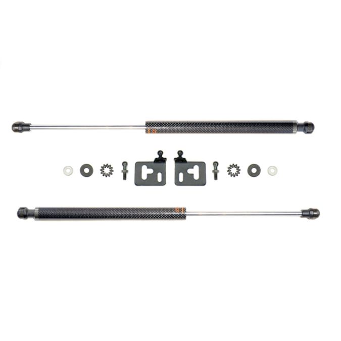 Prosport carbon fiber hood dampers for 1993-2001 Subaru Impreza are a complete kit including the pair of dampers with stainless steel shafts and custom hardware. These are direct-fit, bolt-on dampers that allow you to ditch your hood prop or replace your boring stock dampers with real carbon fiber.