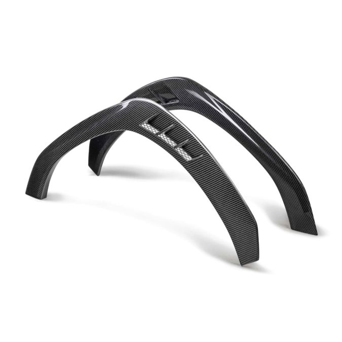 Seibon carbon fiber front fender garnishes for 2022 Subaru WRX. These have a glossy carbon fiber finish and includes replacement garnishes for the left and right front fenders. Also called fender flares or fender caps. Part number FFT22SBIMP.