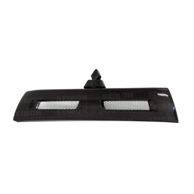 Seibon carbon fiber front grille with the Mitsubishi diamond logo for 2008-2015 Evo X with a glossy carbon fiber finish. Part number FG0809MITEVOX.