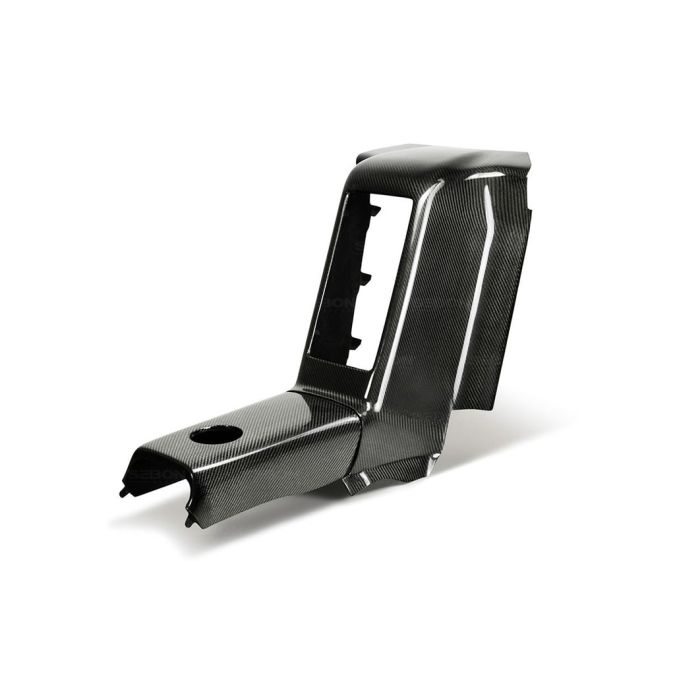 Seibon carbon fiber OEM style rear center console for 2009-2020 Nissan R35 GTR. This piece replaces the factory center armrest cup holder between the back rear seats with a glossy carbon fiber finish. Part number RCC0910NSGTR.