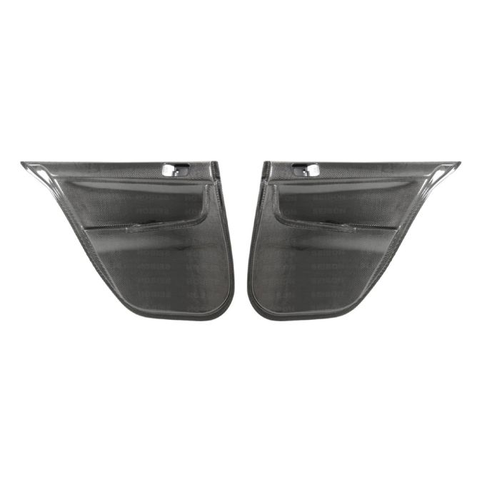 Seibon carbon fiber rear door interior panels for the Evo X models. Includes both rear LH and RH door panels with a glossy carbon fiber finish. Part number DP0809MITEVOX-R.