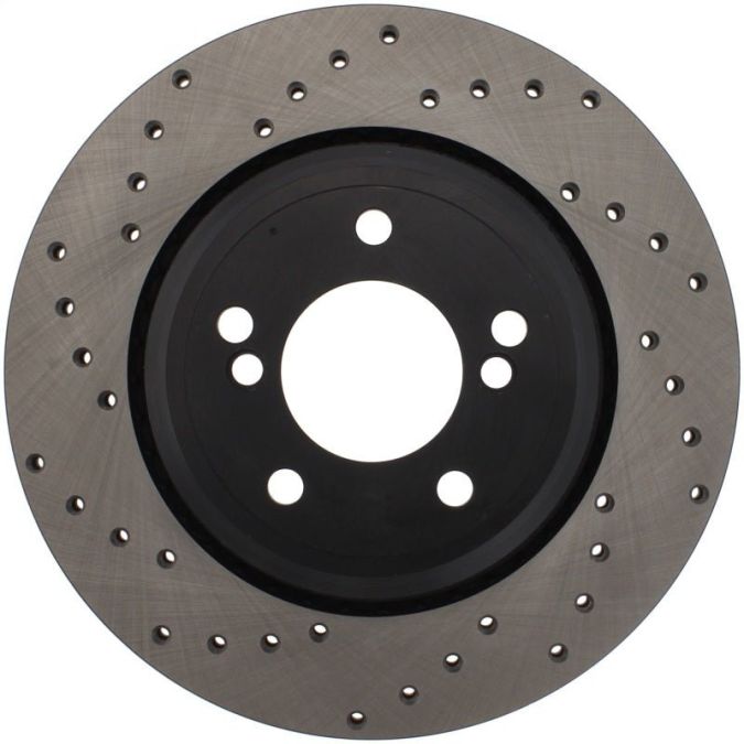 StopTech Drilled Sport Rotors are 1-piece direct replacement brake discs for factory brake systems and stock calipers that look great behind your wheels – and offer significantly improved braking performance. The unique cross-drilling aids with heat and brake dust dispersal, prevents glazing of the pads, adds bite and improves wet and dry braking performance. Built to last, the black e-coating provides protection from corrosion and the high carbon metallurgy (in most applications) offers quieter operation, better crack resistance and increased performance.