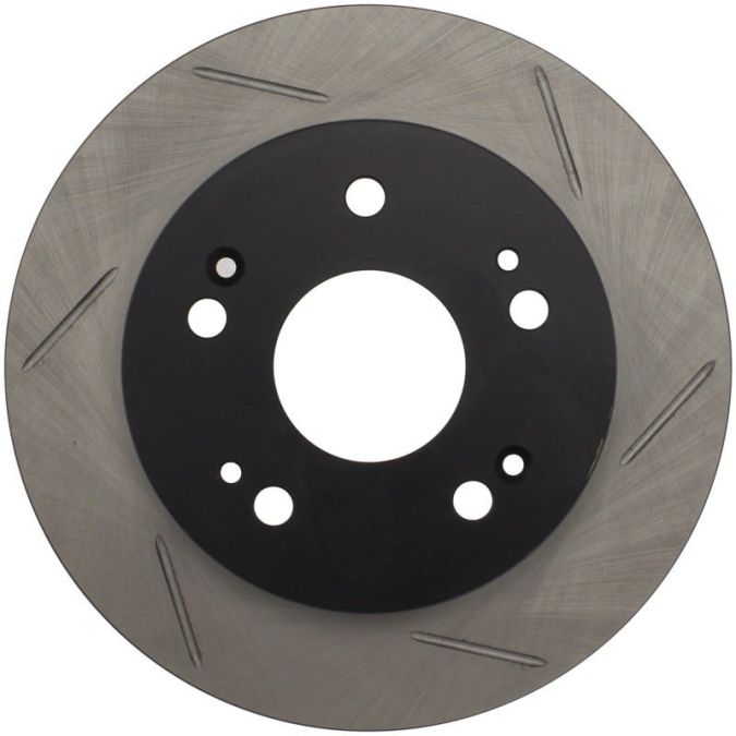 StopTech Slotted Sport Rotors are 1-piece direct replacement brake discs for factory brake systems and stock calipers that look great behind your wheels – and offer significantly improved braking performance. The unique slotting aids with heat and brake dust dispersal, prevents glazing of the pads, adds bite and improves wet and dry braking performance. Built to last, the black e-coating provides protection from corrosion and the high carbon metallurgy (in most applications) offers quieter operation, better crack resistance and increased performance.