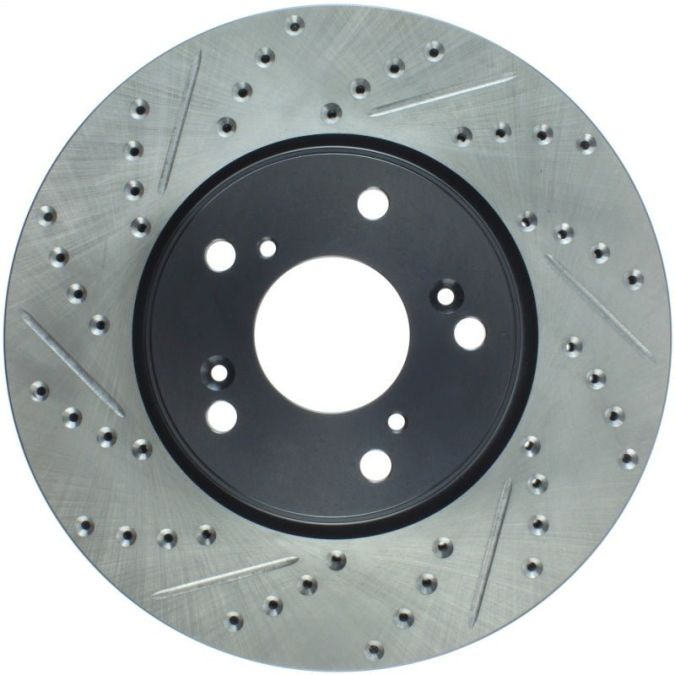 StopTech Drilled and Slotted Sport Rotors are 1-piece direct replacement brake discs for factory brake systems and stock calipers that look great behind your wheels – and offer significantly improved braking performance. The unique cross-drilling and slotting aids with heat and brake dust dispersal, prevents glazing of the pads, adds bite and improves wet and dry braking performance. Built to last, the black e-coating provides protection from corrosion and the high carbon metallurgy (in most applications) offers quieter operation, better crack resistance and increased performance.